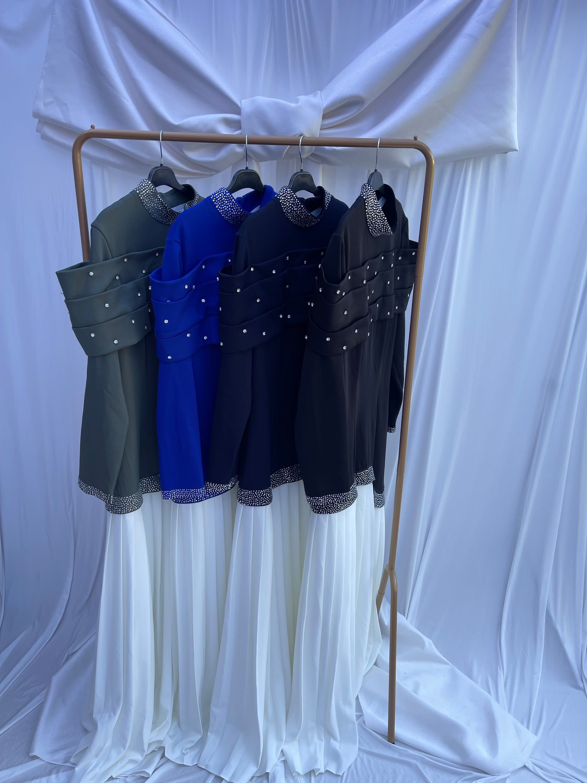 "This elegant dress stands out with its beautiful stone details, which run from the sleeves to the neckline, and from the hem to the bust. The pleated skirt adds the perfect finishing touch."