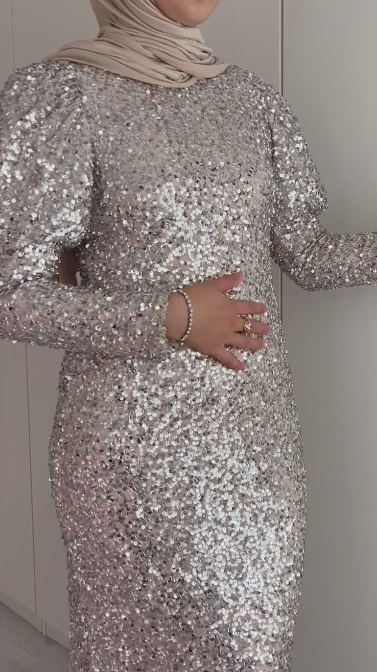 A glamorous evening dress with sequins, balloon sleeves, and feather detailing at the hem. Perfect for anyone who loves a touch of sparkle.