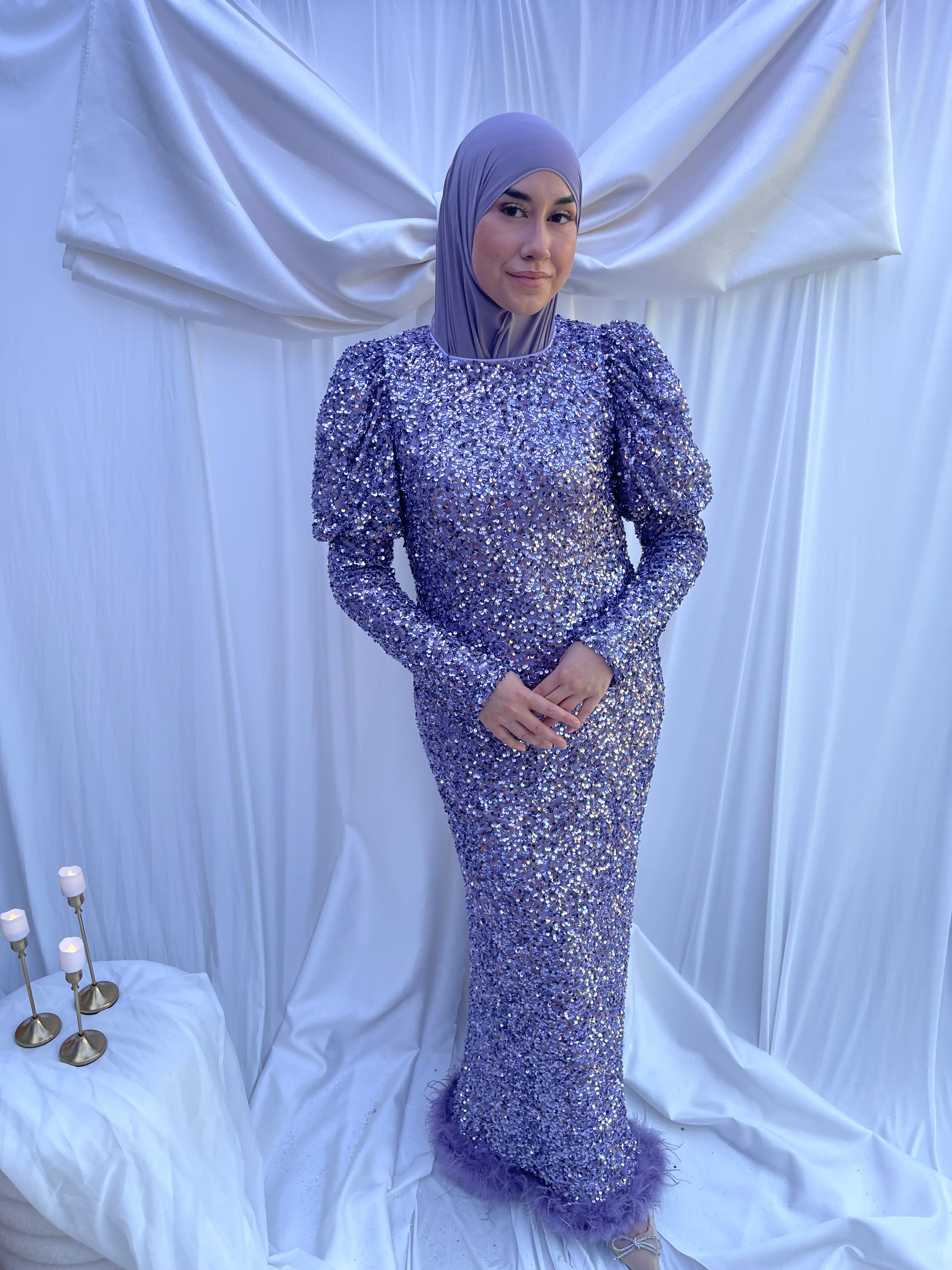 A glamorous evening dress with sequins, balloon sleeves, and feather detailing at the hem. Perfect for anyone who loves a touch of sparkle.