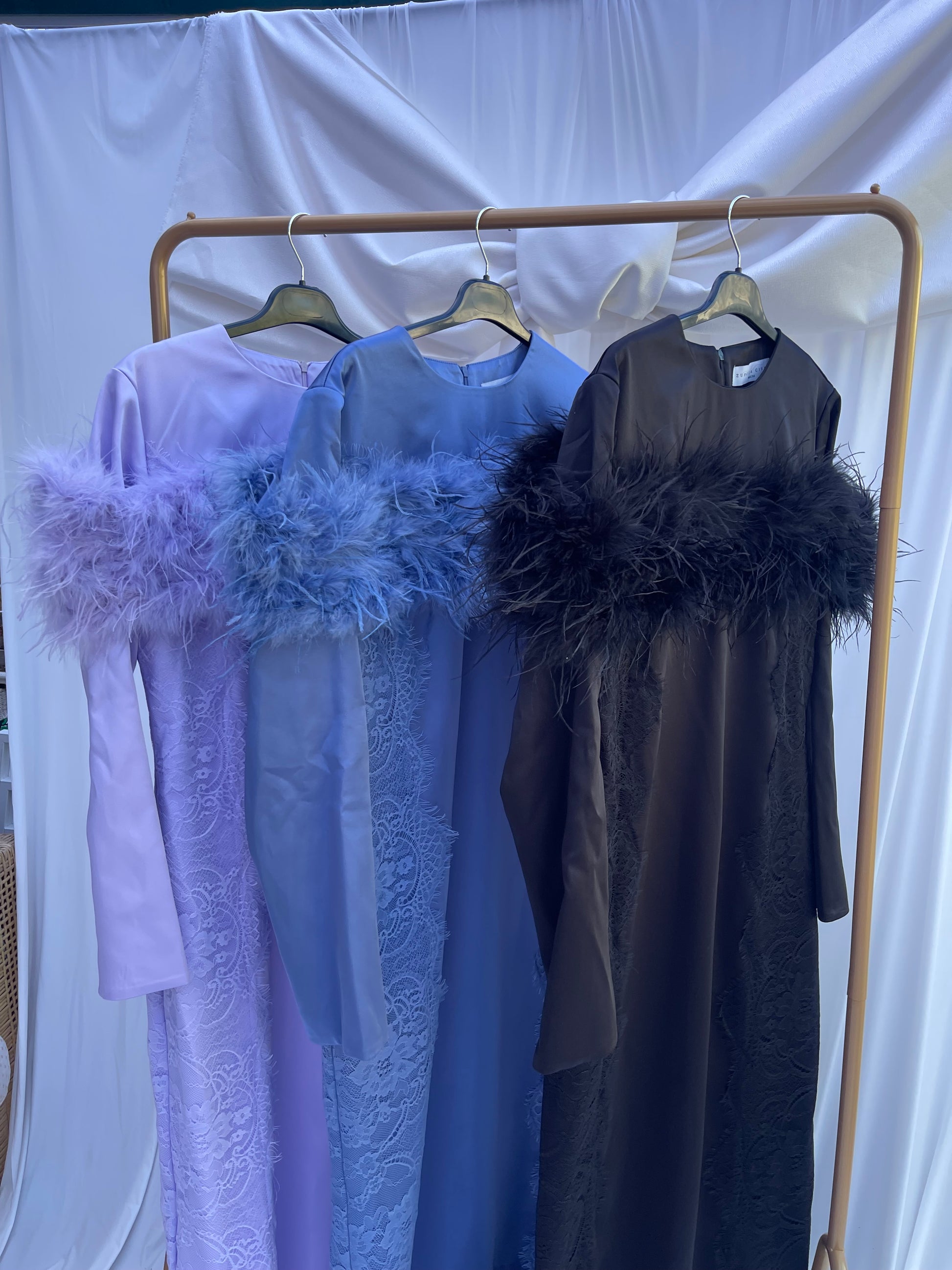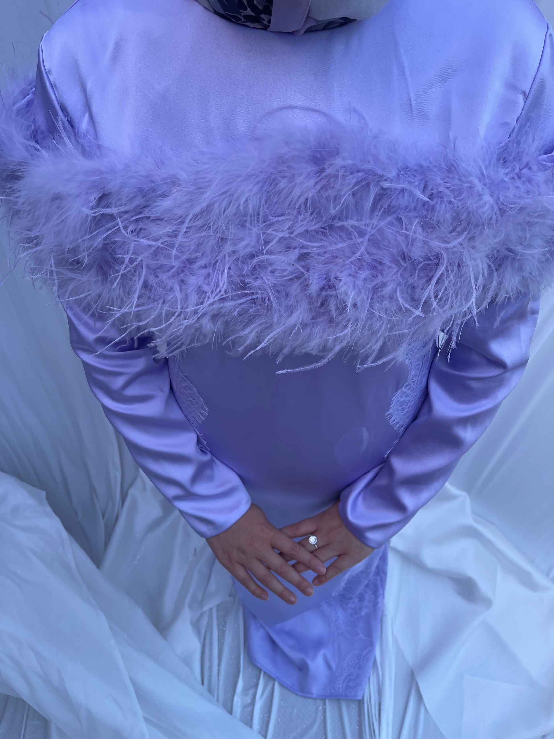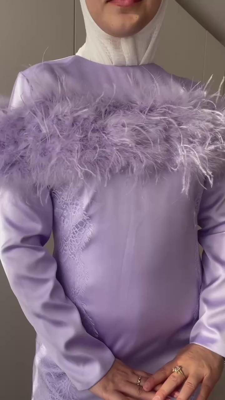 A beautiful dress that stands out with the elegance of satin, lace, and feather details